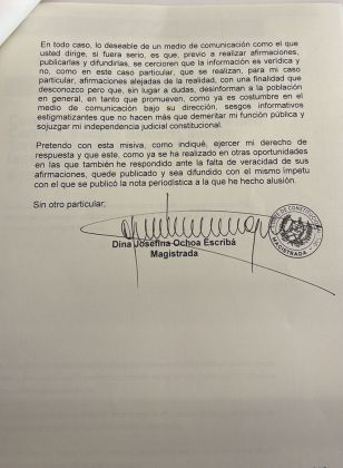 En esta publicación se incluyó el nombre de la magistrada de la Corte de Constitucionalidad (CC) Dina Josefina Ochoa Escribá, dentro de un grupo de funcionarias que se menciona habrían hecho mal uso de la Ley contra el Femicidio y Otras Formas de Violencia contra la Mujer para evitar la crítica pública o la fiscalización periodística.