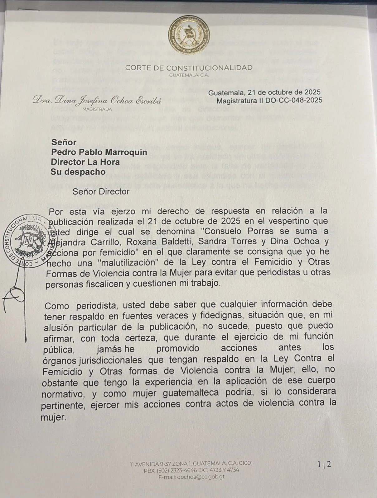 «Jamás he promovido acciones ante los órganos jurisdiccionales que tengan respaldo en la Ley contra el Femicidio y otras Formas de Violencia contra la Mujer; ello no obstante que tengo la experiencia en la aplicación de ese cuerpo normativo, y como mujer guatemalteca podría, si lo considerara pertinente, ejercer mis acciones contra actos de violencia contra la mujer», apunta en la carta la magistrada Ochoa Escribá.