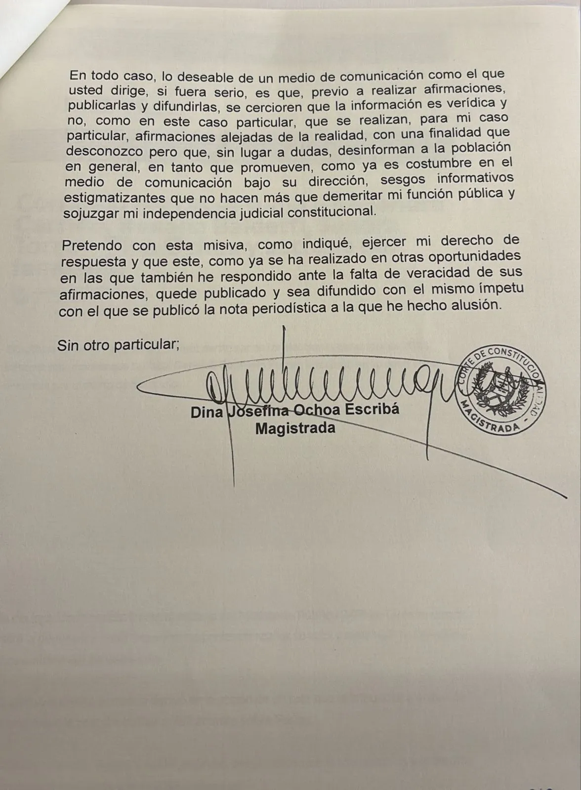 En esta publicación se incluyó el nombre de la magistrada de la Corte de Constitucionalidad (CC) Dina Josefina Ochoa Escribá, dentro de un grupo de funcionarias que se menciona habrían hecho mal uso de la Ley contra el Femicidio y Otras Formas de Violencia contra la Mujer para evitar la crítica pública o la fiscalización periodística.