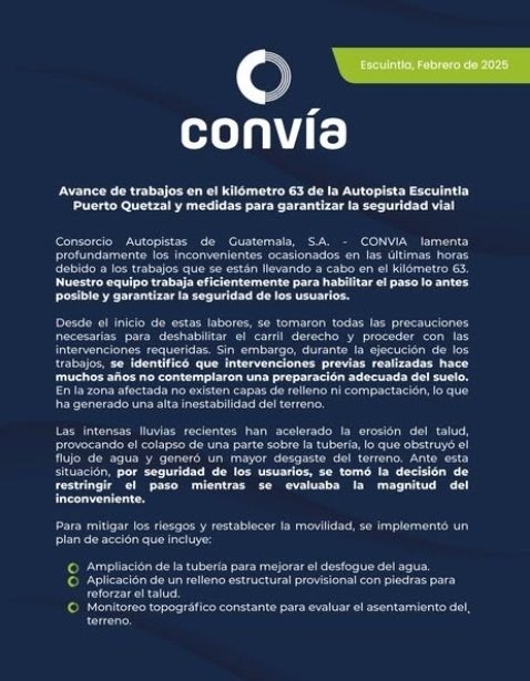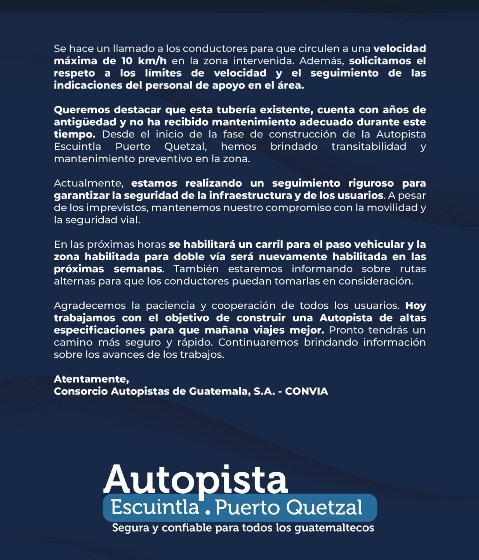 Usuarios en redes sociales reportan congestión vehicular en las vías y por el momento la PMT de Escuintla, se encuentra apoyando con el control vehicular para facilitar el paso, de igual manera la empresa CONVIA, recomienda por seguridad circular a 10 km/h en el área intervenida.