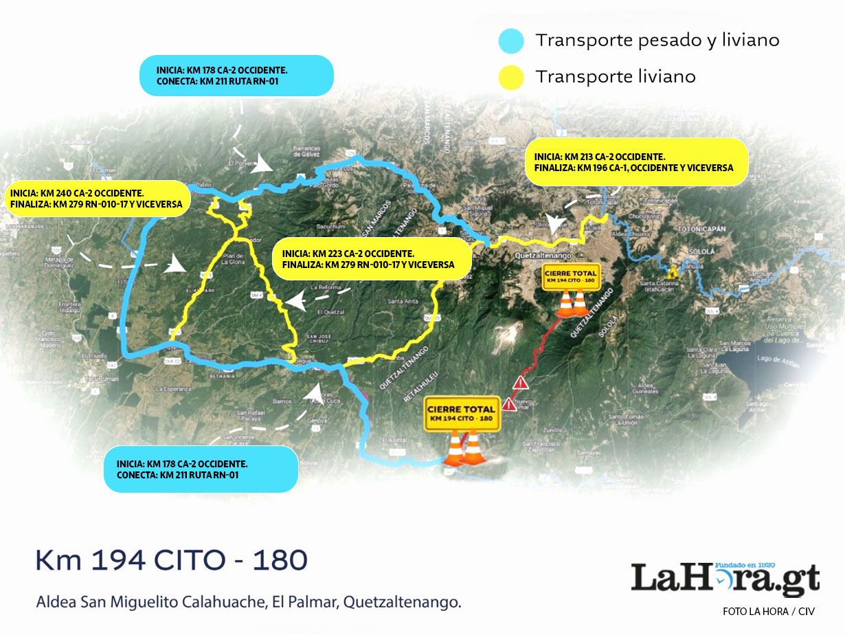 Ante el colapso de un carril en el kilómetro 194 de la carretera Cito Zarco, a la altura de la aldea San Miguelito Calahuache, en El Palmar, Quetzaltenango, la Dirección de Protección y Seguridad Vial (Provial), informó este lunes sobre la habilitación de rutas alternas para descongestionar el tránsito en el área.