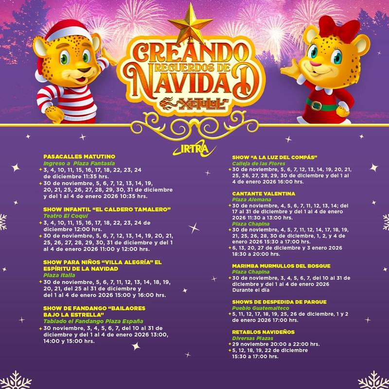 El parque Xetulul abrirá su temporada navideña el 29 de noviembre, con horario de 10:00 a 22:00 horas. La inauguración, titulada “Creando Recuerdos”, incluirá un show especial, conteo regresivo e iluminación del parque en la Plaza Chapina a las 18:30 horas, seguido de un desfile con cantantes, retablos, posada y un espectáculo de luces para cerrar la noche.