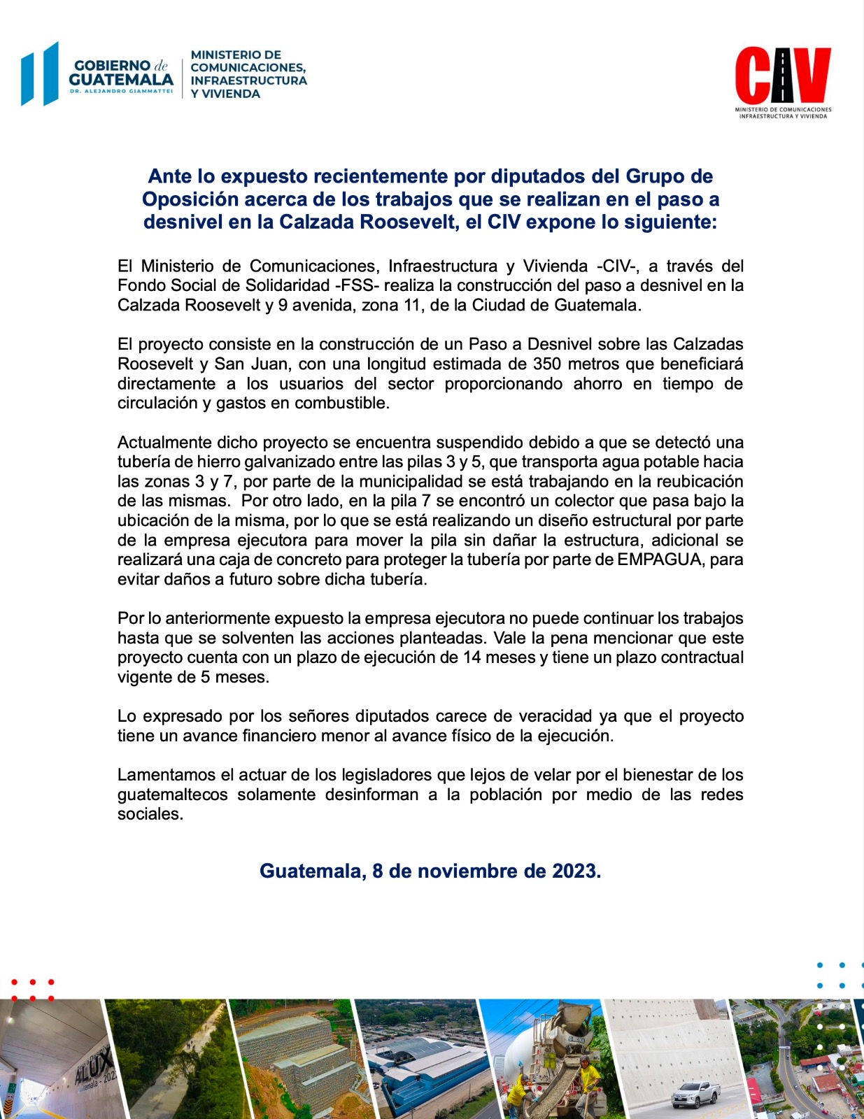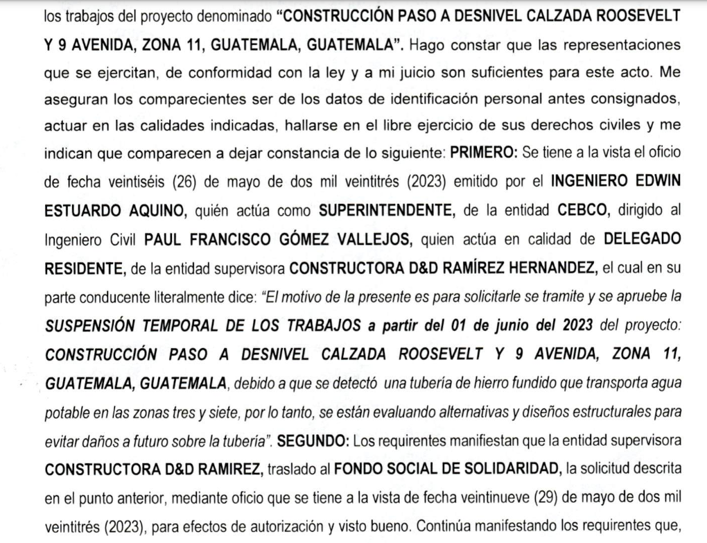 Por otro lado, en cuanto al paso a desnivel de la Calzada Roosevelt, hay un acta de suspensión el 31 de mayo 2023 con el argumento de que se detectó una tubería de hierro fundido que transporta agua potable a las zonas 3 y 7, por lo cual se estarían evaluando alternativas para evitar dañar la citada tubería.