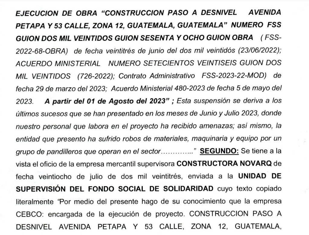 En Guatecompras la referida empresa justificó el no poder continuar con los trabajos en el paso a desnivel de la Avenida Petapa, por ser víctima de las pandillas. Se emitió un acta de suspensión en agosto 2023.