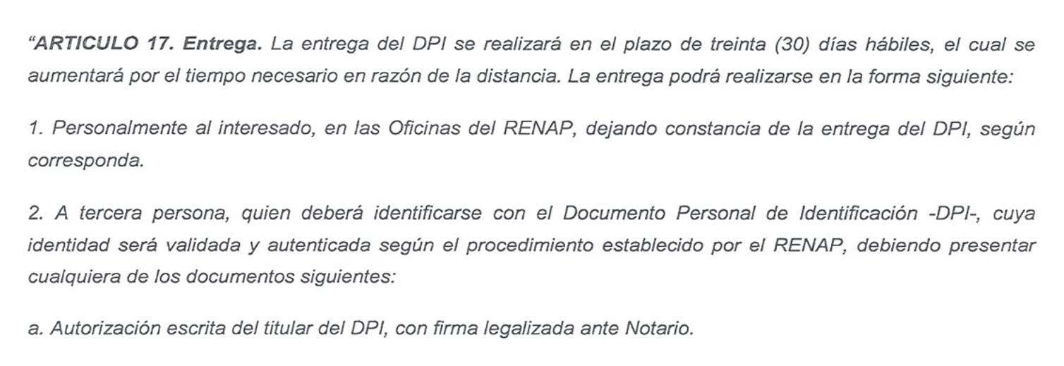 Cabe recalcar que «la entrega del DPI se realizará en el plazo de 30 días hábiles, el cual se aumentará por el tiempo necesario en razón de la distancia», se lee en el reglamento.