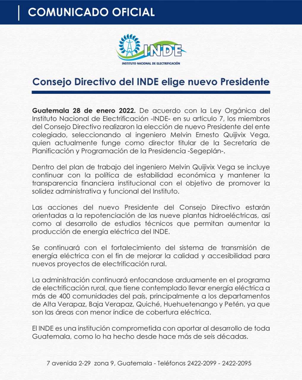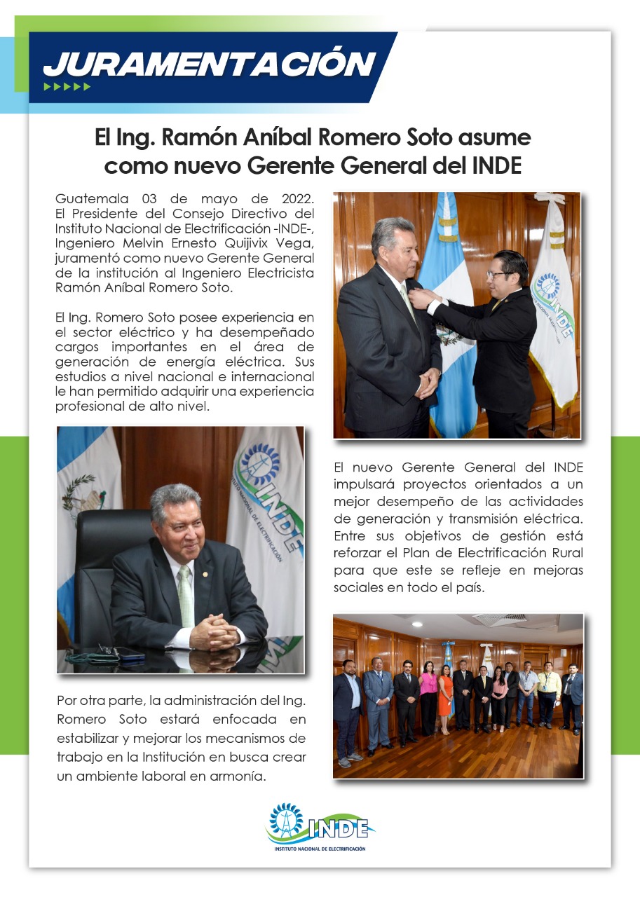 Quijivix juramentó a Ramón Aníbal Romero Soto como el nuevo gerente general del INDE, el 3 de mayo de 2022. Romero Soto fue quien firmó los contratos de Velasco Díaz.