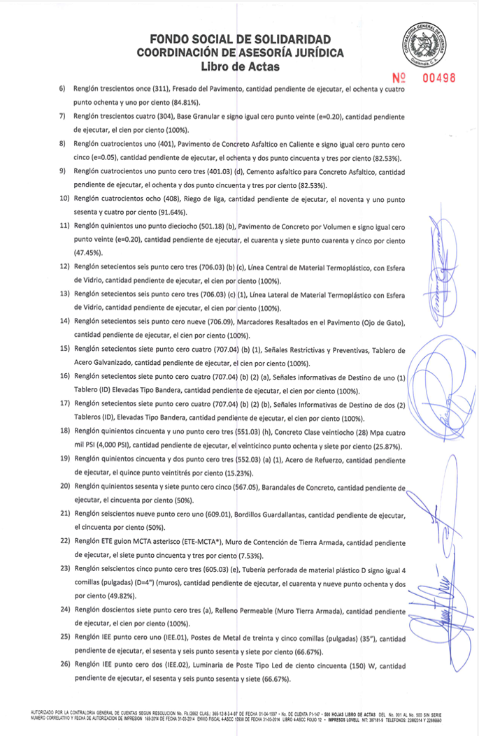 Sin embargo, en el portal Guatecompras, no se adjuntó más documentación sobre el avance de la obra. La información más reciente es el acta del FSS, el cual enlistó 27 trabajos que estaban pendientes de ejecución, algunos en un 100%.