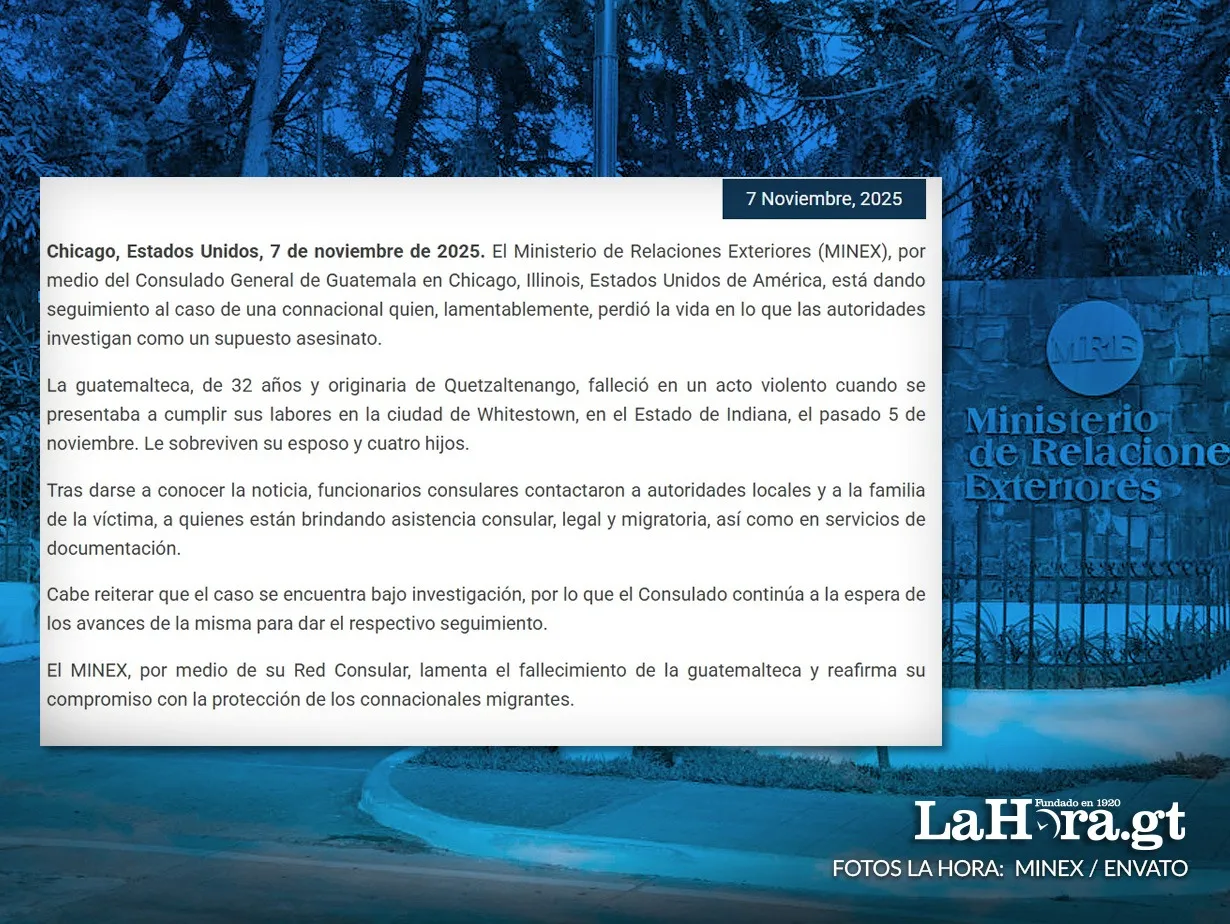 El Ministerio de Relaciones Exteriores (Minex) informó este viernes 7 de noviembre que, por medio del Consulado General de Guatemala en Chicago, da seguimiento al caso de una connacional que perdió la vida en un hecho violento ocurrido en la ciudad de Whitestown, Indiana, Estados Unidos.