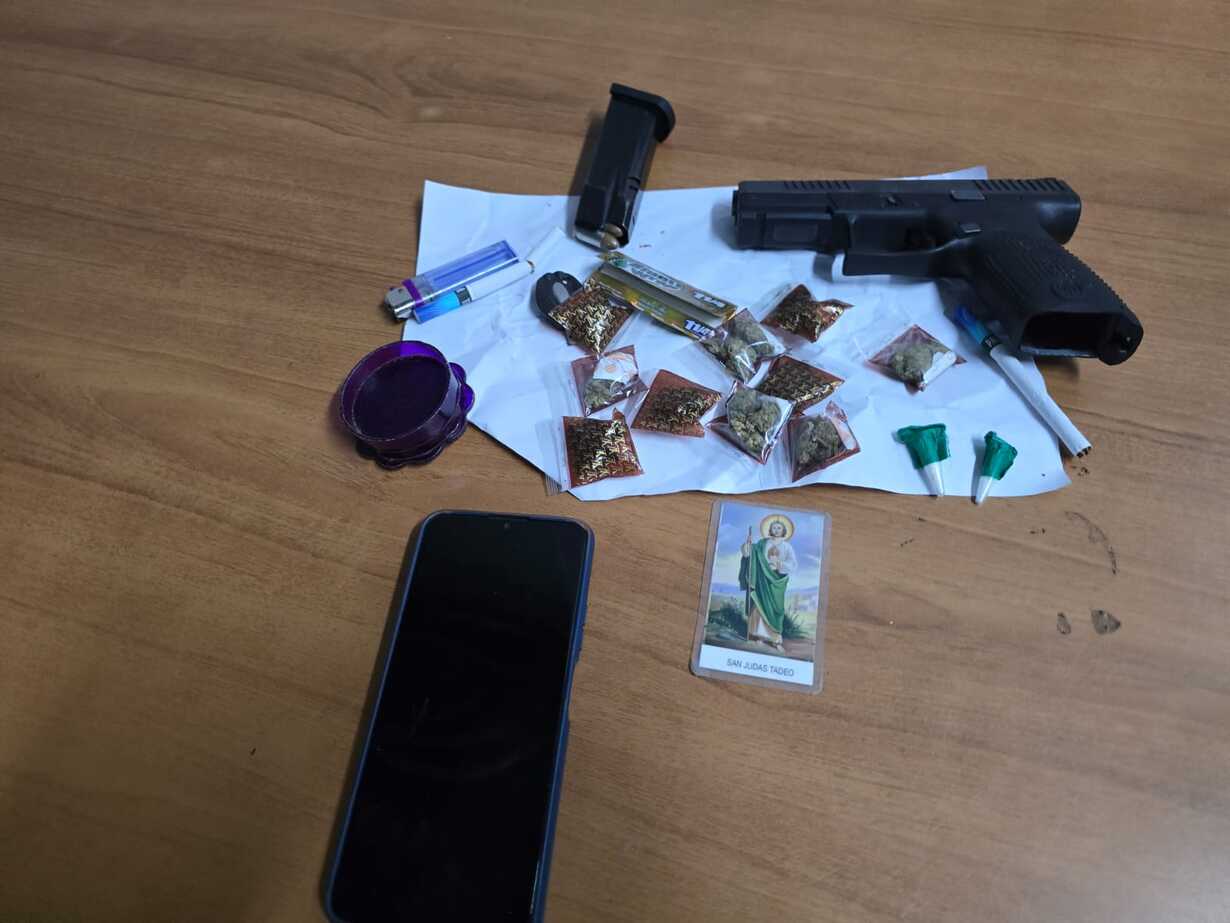 Además del arma de fuego, a los capturados se les localizaron nueve bolsitas con marihuana y dos “colmillos” con cocaína, según el informe policial. Los tres se movilizaban a bordo de una motocicleta con placas M-476HNQ, la cual también fue consignada para fines de investigación.
