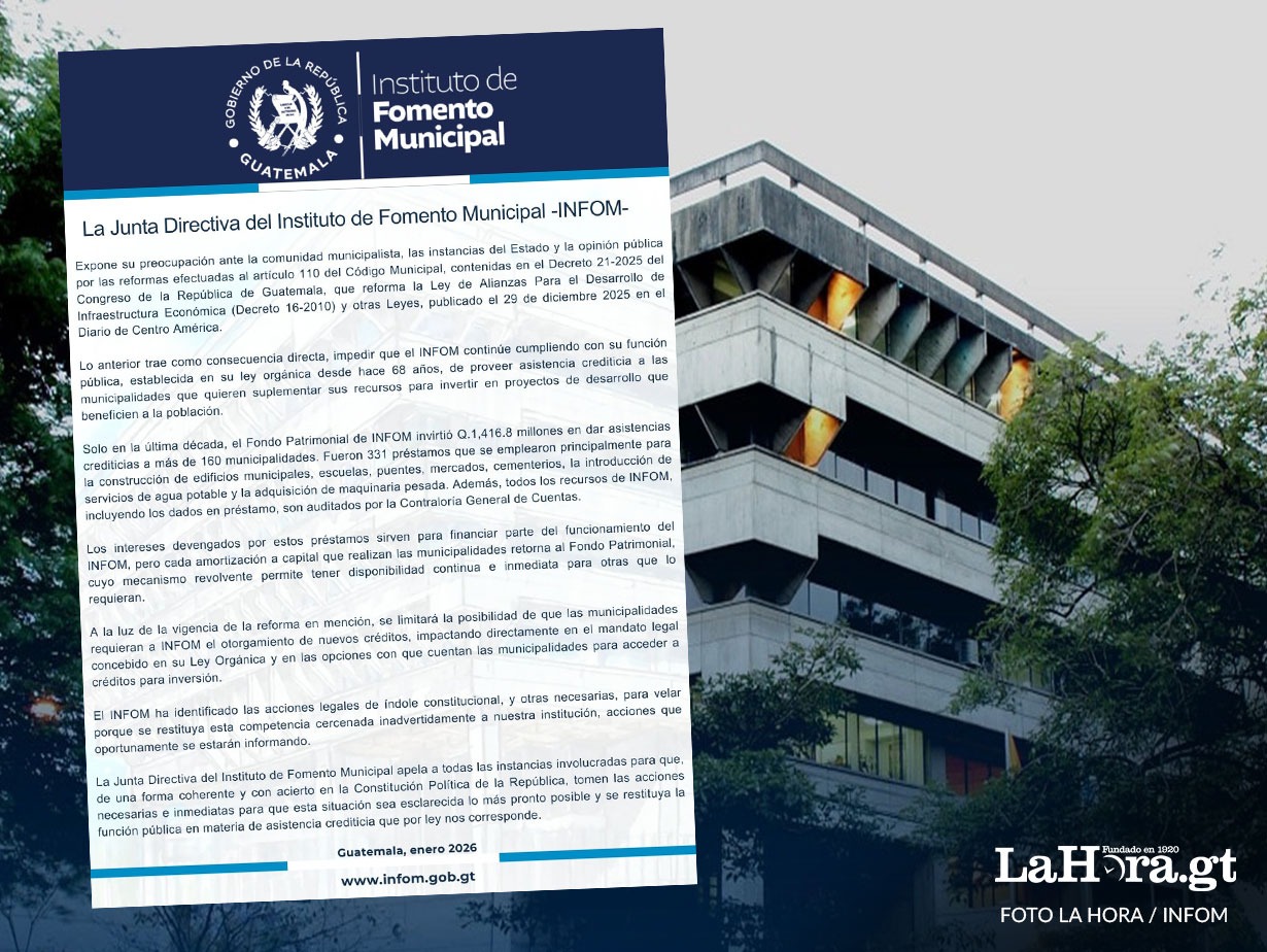 El Instituto de Fomento Municipal (Infom) expresó su preocupación ante las reformas al artículo 110 del Código Municipal, incluidas en el Decreto 21-2025 publicado el 29 de diciembre de 2025 por el Congreso de la República.