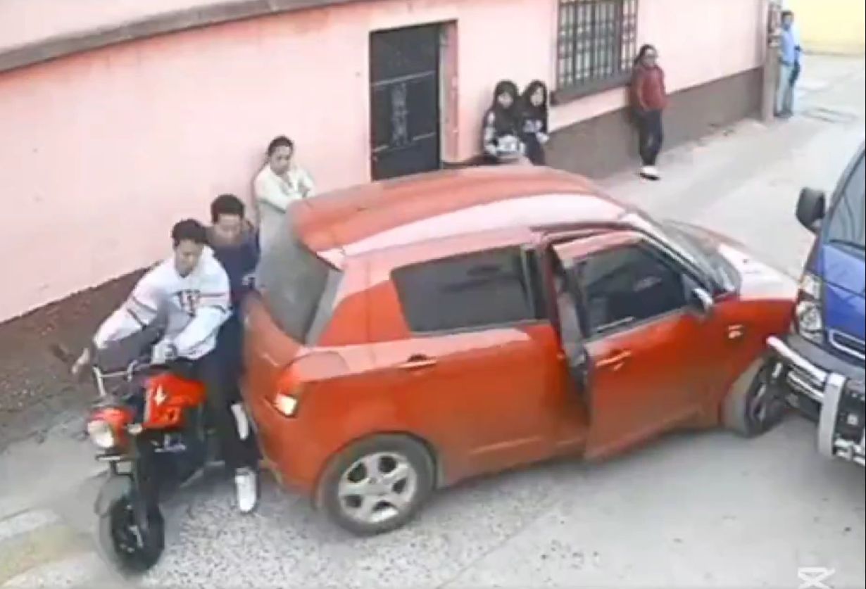 En ese instante, el piloto del carro retrocedió e impactó a los dos jóvenes que iban en el vehículo de dos ruedas ante la presencia de varios vecinos, de acuerdo con la grabación.