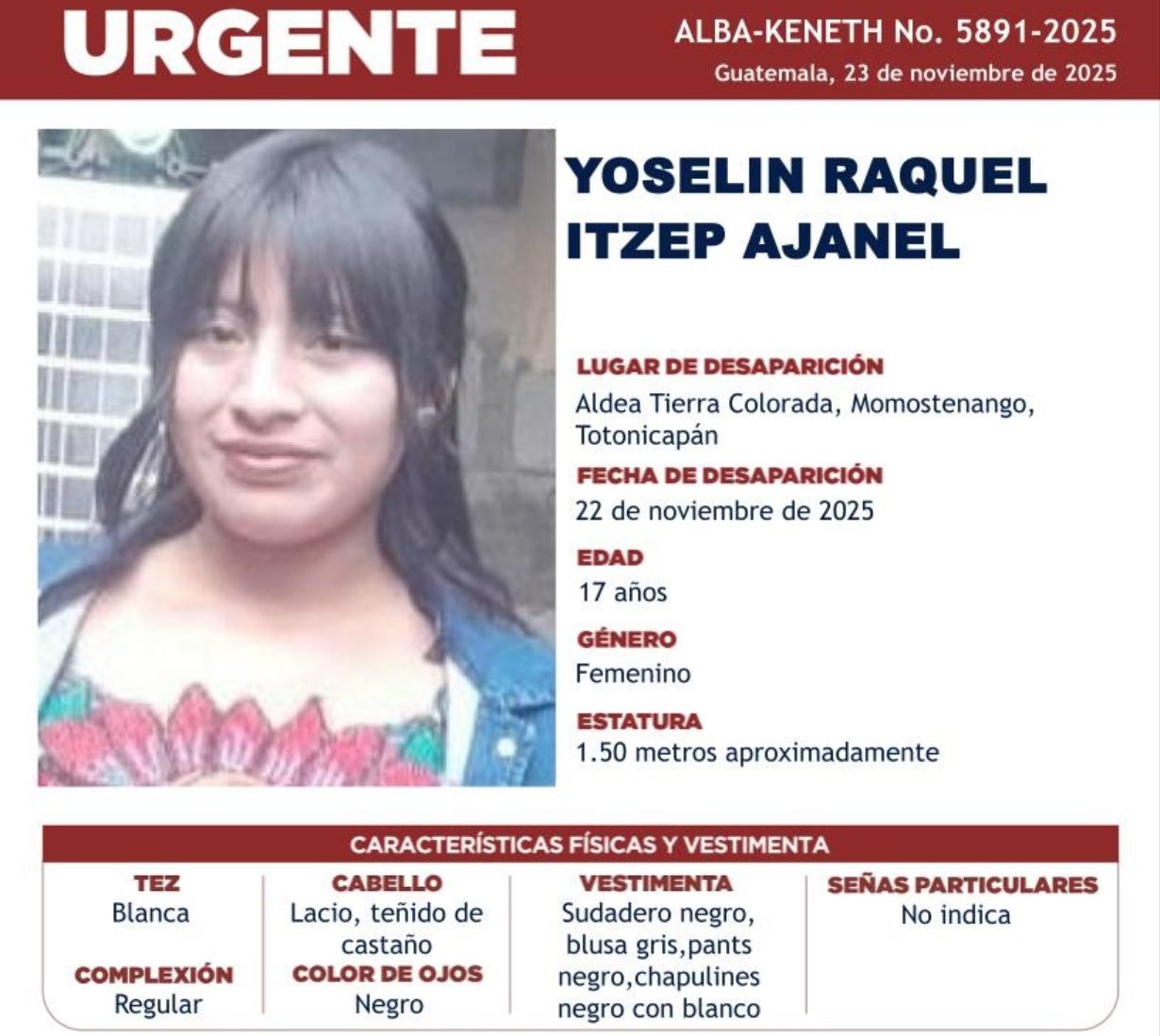 Su desaparición se hizo pública en la Unidad Operativa de la Coordinadora Nacional del Sistema de Alerta Alba-Keneth, desde esa fecha en la aldea Tierra Colorada, Momostenango, Totonicapán.