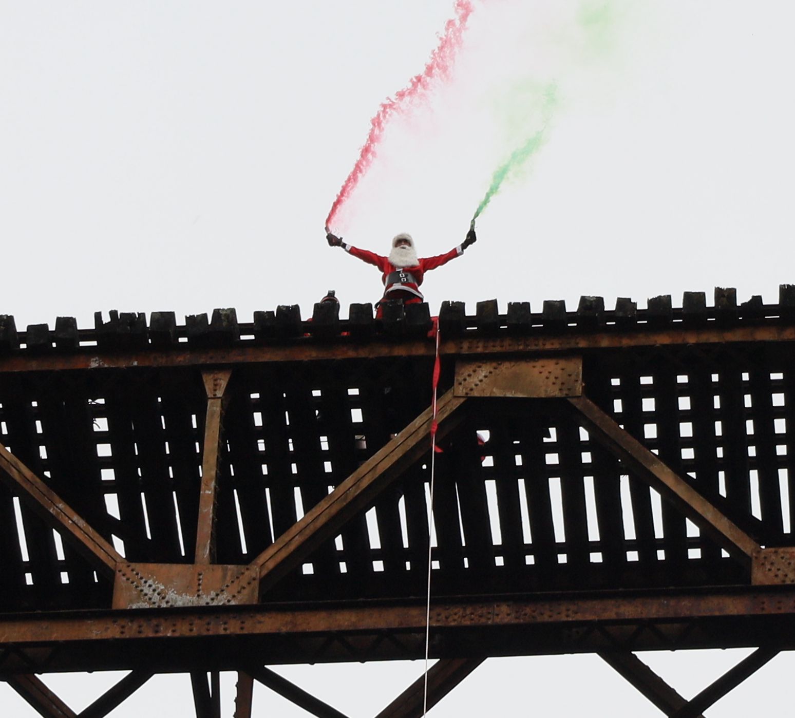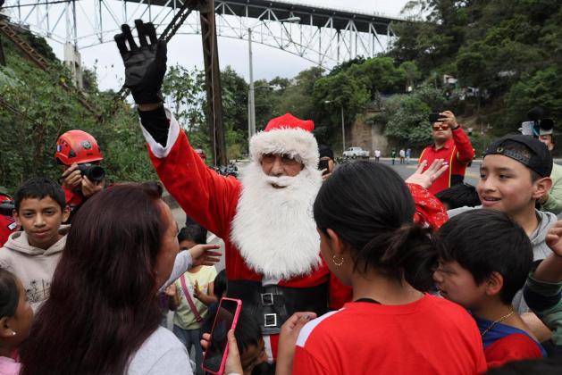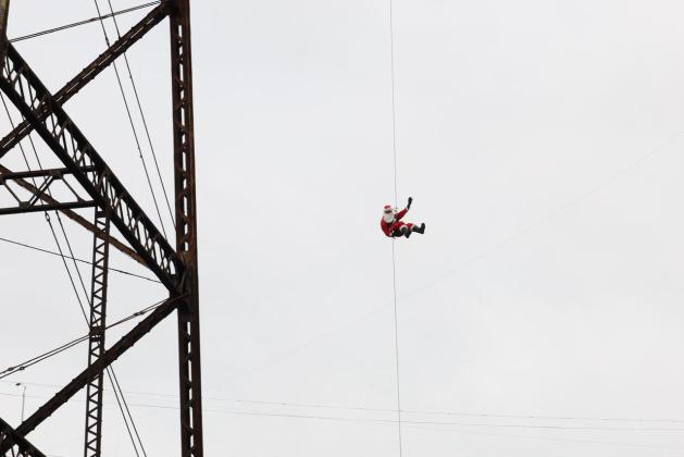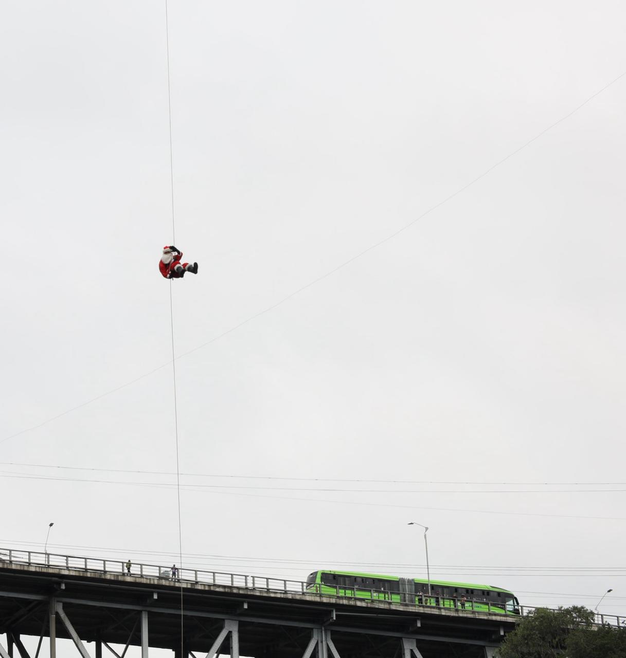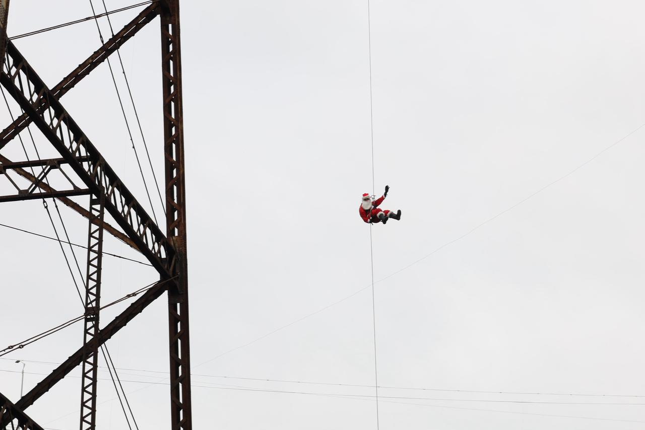 Vestido de personaje de Santa Claus, Chacón descendió de una altura de 70 metros para sorprender a los pequeños que lo esperaban abajo, actividad que forma parte de las celebraciones de fin de año.