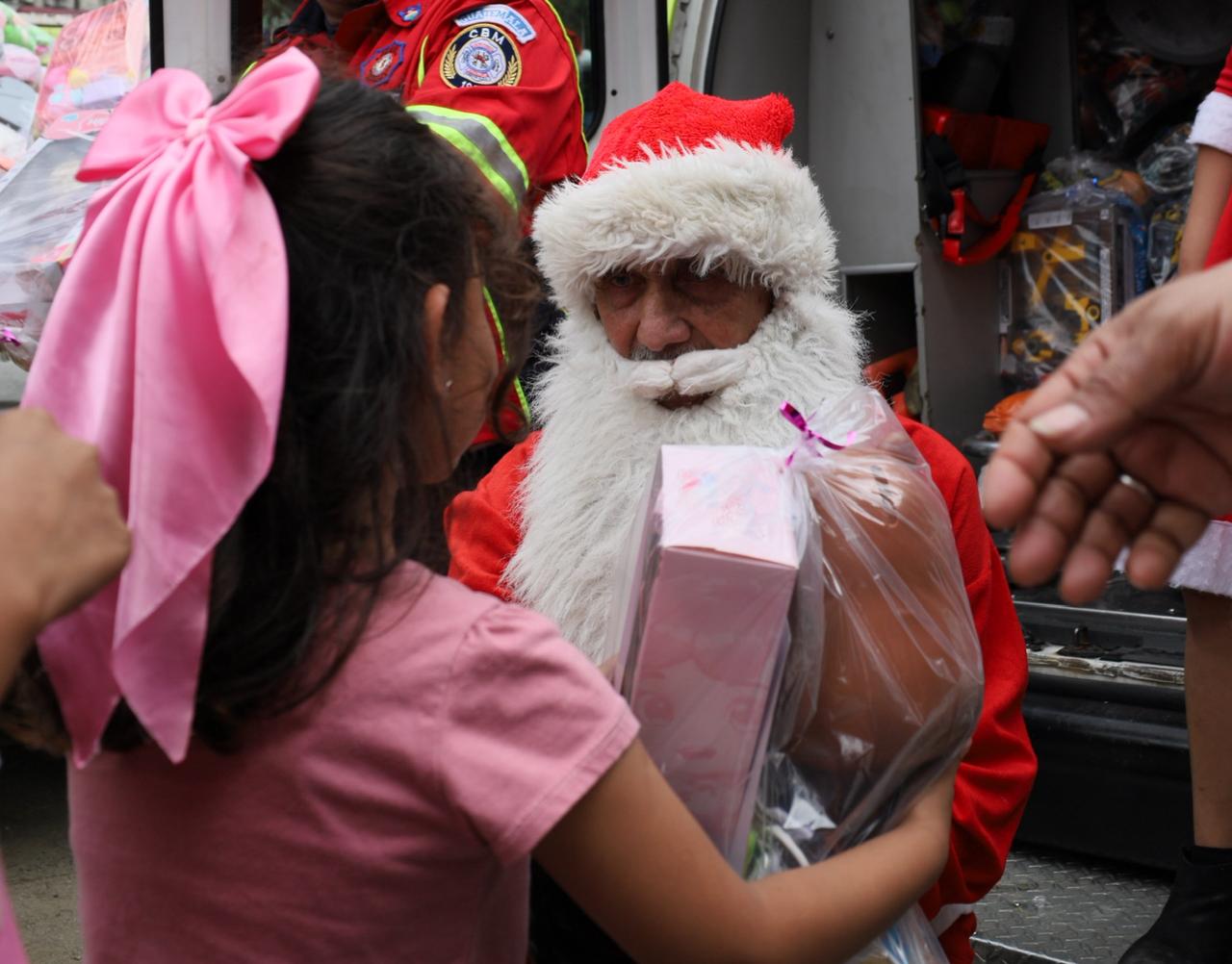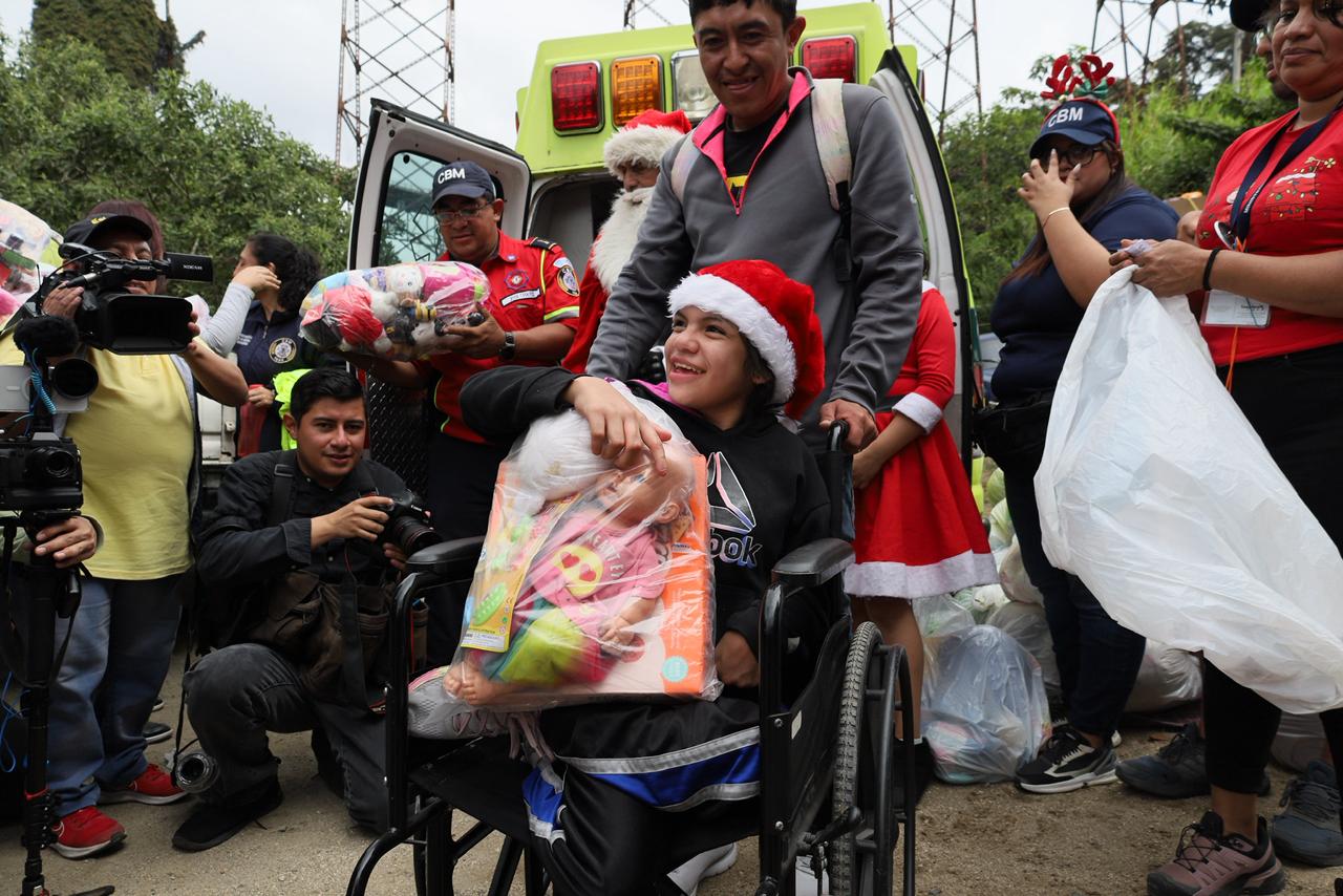 Tras su descenso, hizo entrega de unos 500 juguetes a los menores, obsequios que la institución recaudó con anticipación. También recibieron apoyo de vecinos que llevaron donativos.