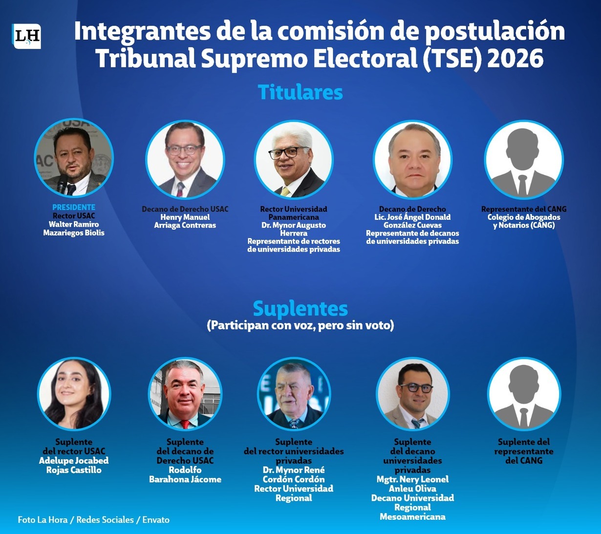 Los suplentes, quienes tiene participación verbal, más no voto, son Adelupe Jocabed Rojas Castillo, quien es la suplente del Rector de la Usac; Rodolfo Barahona Jácome, auxiliar del Decano de Derecho de la USAC; Mynor René Cordón y Cordón, Rector de la Universidad Regional, y Nery Leonel Anleu Oliva, Decano de la Universidad Mesoamericana, ambos también representantes de las casas de estudios privadas.
