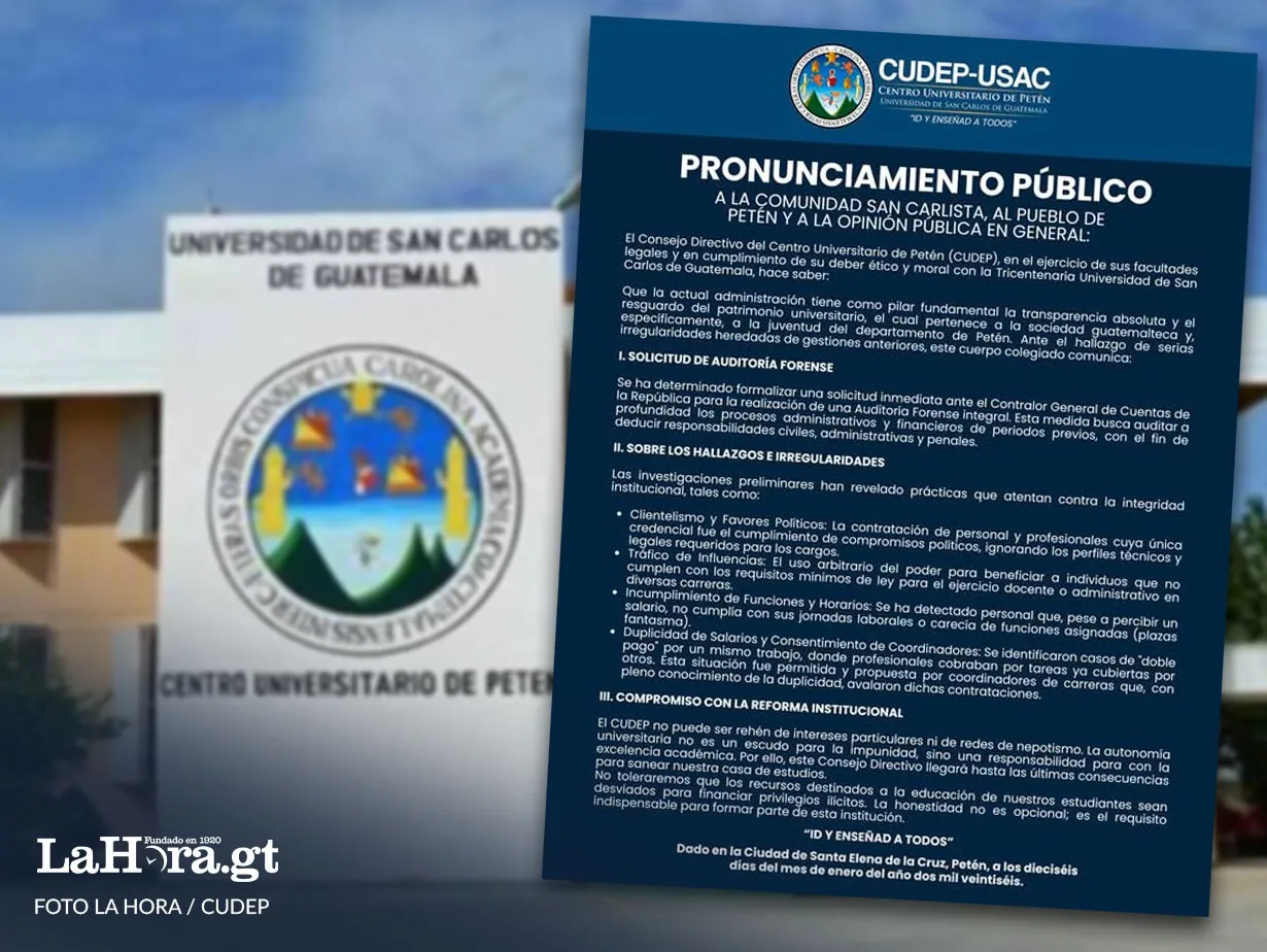 Tras el hallazgo de graves irregularidades financieras y administrativas heredadas de gestiones anteriores, el Consejo Directivo del Centro Universitario de Petén (Cudep), de la Universidad de San Carlos de Guatemala, anunció este 16 de enero el inicio de un proceso legal y administrativo para sanear la institución, según lo anunció en un pronunciamiento público en su cuenta.