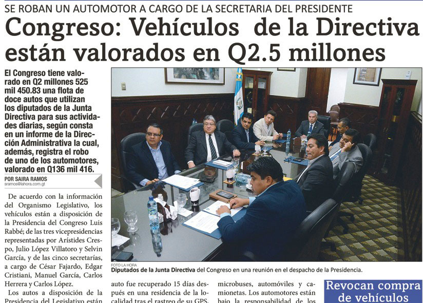 De acuerdo con la publicación de La Hora, el Congreso tiene valorado en Q2 millones 525 mil 450.83 una flota de doce autos que utilizan los diputados de la Junta Directiva para sus actividades diarias, según consta en un informe de la Dirección Administrativa.