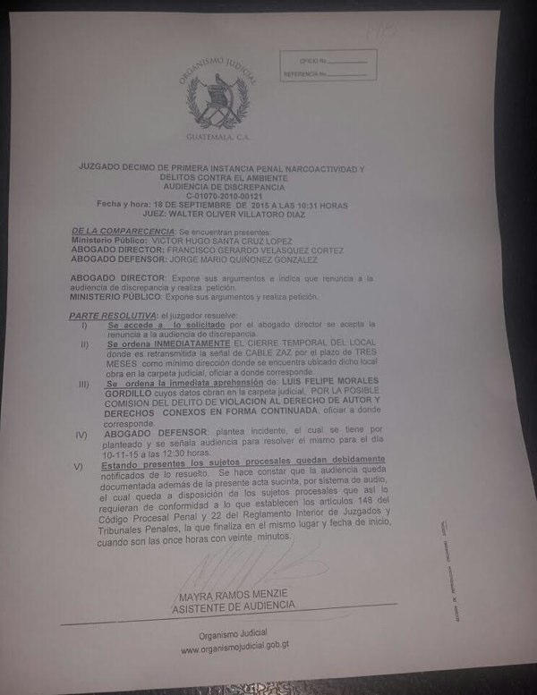 El juzgado Décimo de Primera Instancia Penal de la Narcoactividad y Delitos contra el Ambiente ordenó cerrar de forma temporal la empresa de cable ZAZ ubicada en Boca del Monte. Por otro lado, el Ministerio Público (MP) allanó ayer la empresa de cable del diputado Jimmy Ren, en Quiché.