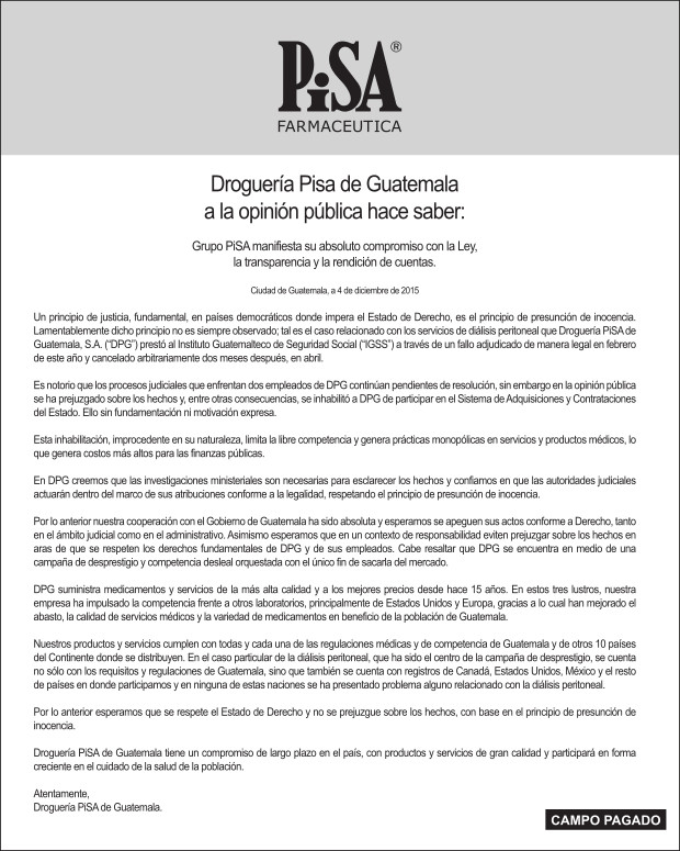A través de un comunicado de prensa difundido hoy, Droguería Pisa de Guatemala (DPG) rechazó la inhabilitación para su participación en el Sistema de Adquisiciones y Contrataciones del Estado, a su criterio, sin fundamentación ni motivación.