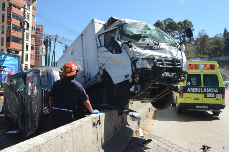 Una mujer con ocho meses de embarazo fue afectada tras una múltiple colisión entre un camión y cuatro vehículos, en el Trébol de Vista Hermosa en la zona 15. Ella viajaba en uno de los automotores involucrados en el accidente.