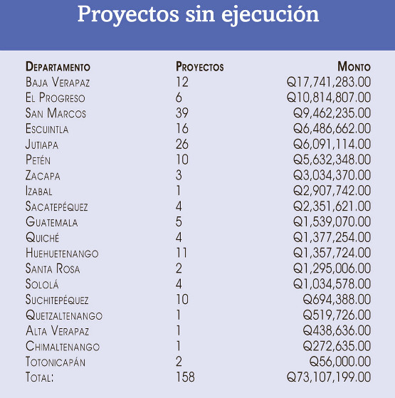 El Estado pagó el año pasado Q73 millones 107 mil 199 por 158 proyectos incluidos dentro del Listado Geográfico de Obras (LGO), que a la fecha muestran un 0 por ciento de avance en los trabajos para los que fueron contratados, según el bloque Encuentro por Guatemala (EG), que anunció acciones legales en contra de los responsables.