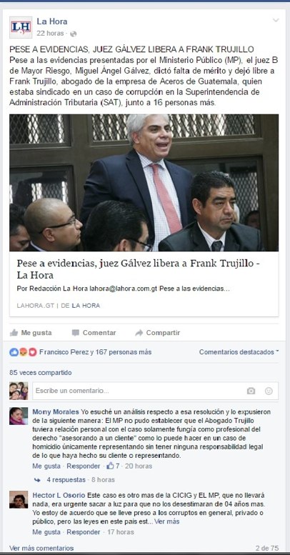 Héctor L Osorio: Este caso es otro más de la CICIG y el MP que no llevará nada, era urgente sacar a luz para que no los desestimaran de 4 años más. Yo estoy de acuerdo que se lleve preso a los corruptos en general, privado o público, pero las leyes en este país están para proteger al dueño de la guayaba (como dijo un ex, que anda fugado), o a los corruptos y ladrones. No me acuerdo donde leí que estas escuchas vienen desde 2008 ¿y en esa época quien gobernaba? ¿o solo los de la SAT tenían desde esa época el control? Aceros va a pagar al final una multa de unos 20 melones y ahí termina el problema.