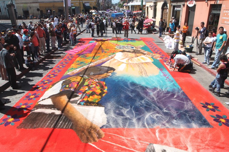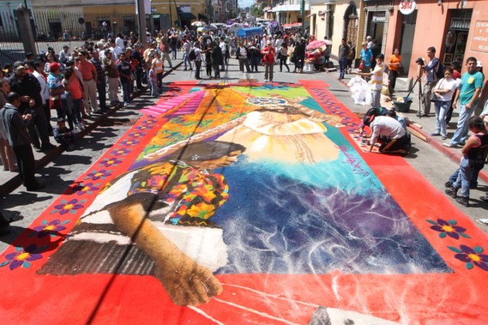 Frente a la Iglesia La Merced en la zona 1 capitalina Jorge Corleto y miembros del Colectivo “Chucho Callejero” realizaron una alfombra artística, la cual llevó al menos doce horas para su elaboración.