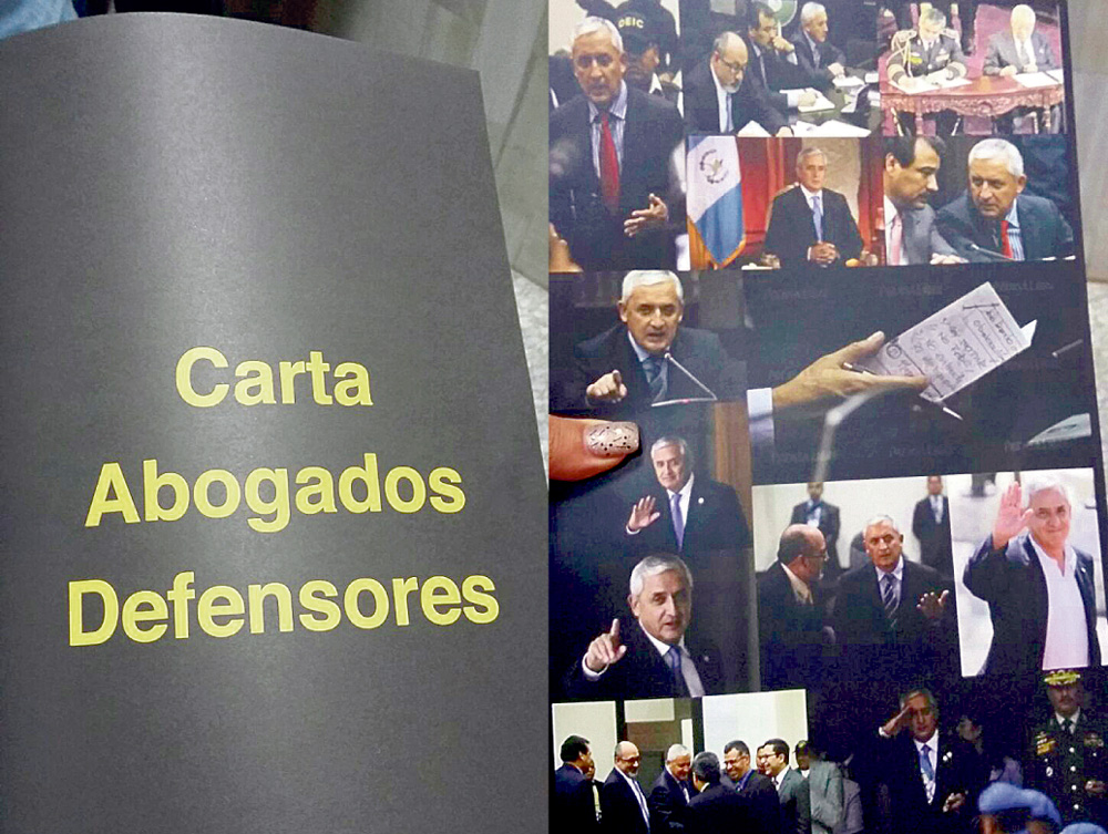 Junto al exmandatario llegó su abogado, Moisés Galindo, quien comenzó a repartir a los periodistas presentes un folleto con el título “El Caso La Línea”, que contenía resumida la acusación que ese mismo día el MP y la Comisión Internacional contra la Impunidad en Guatemala (CICIG) explicarían ante el juez. Más de 100 ejemplares se entregaron a la audiencia.