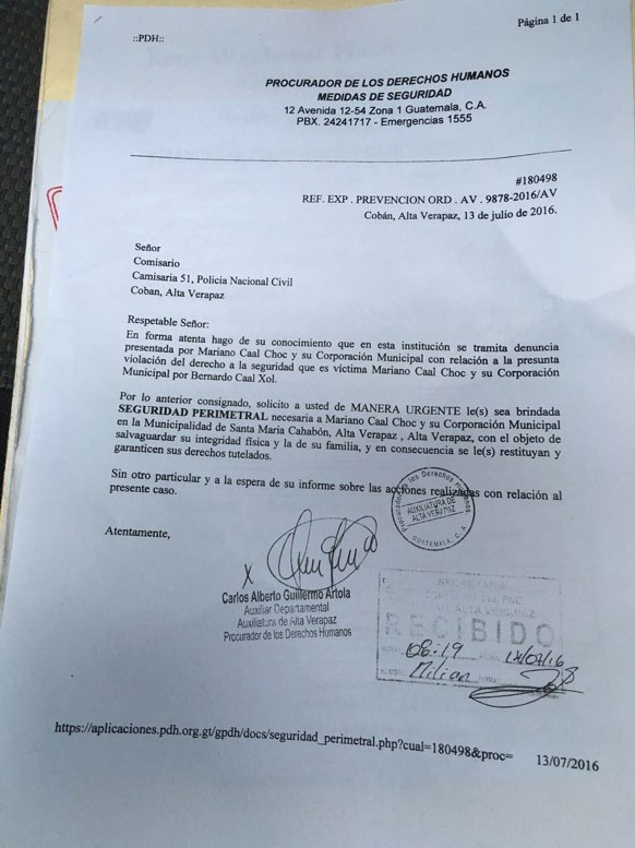 En una misiva, el auxiliar Carlos Alberto Guillermino solicitó a la Policía que de manera urgente se le brinde seguridad perimetral al jefe edil de Cahabón, Mariano Caal Choc y a su corporación municipal, con el objeto de resguardar su integridad física y la de su familia por violación a su seguridad por el señor Bernardo Caal Xol.