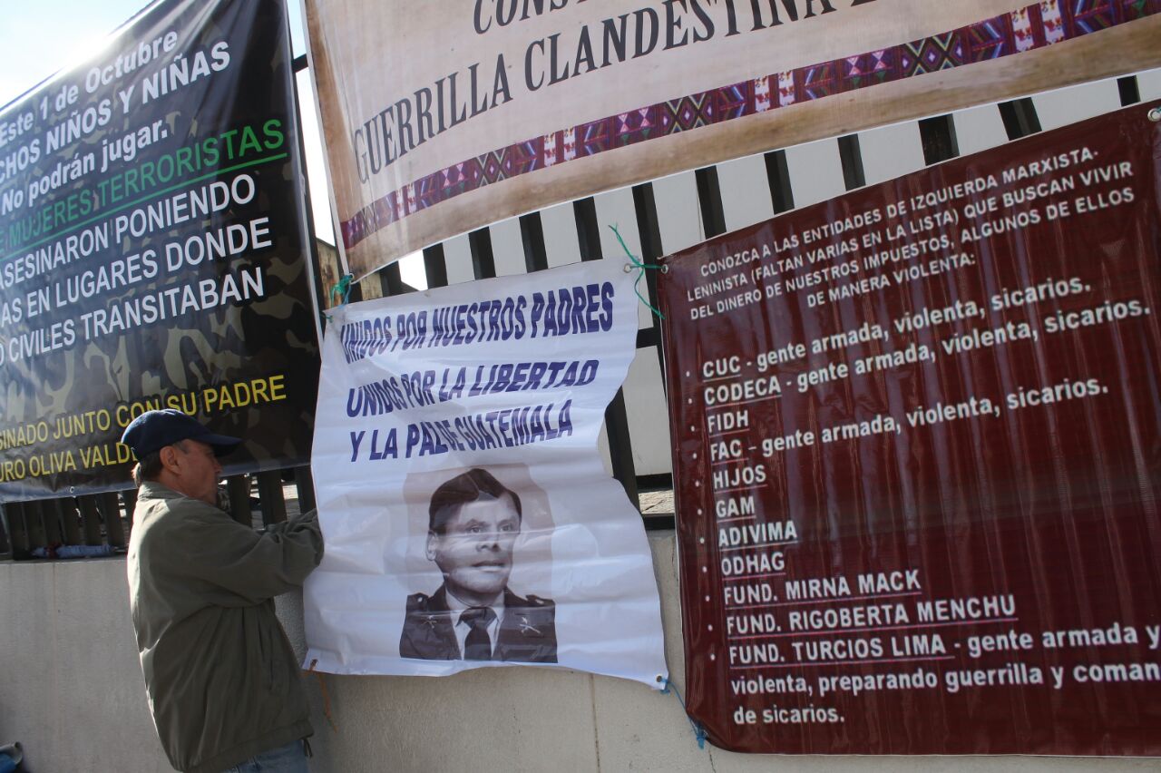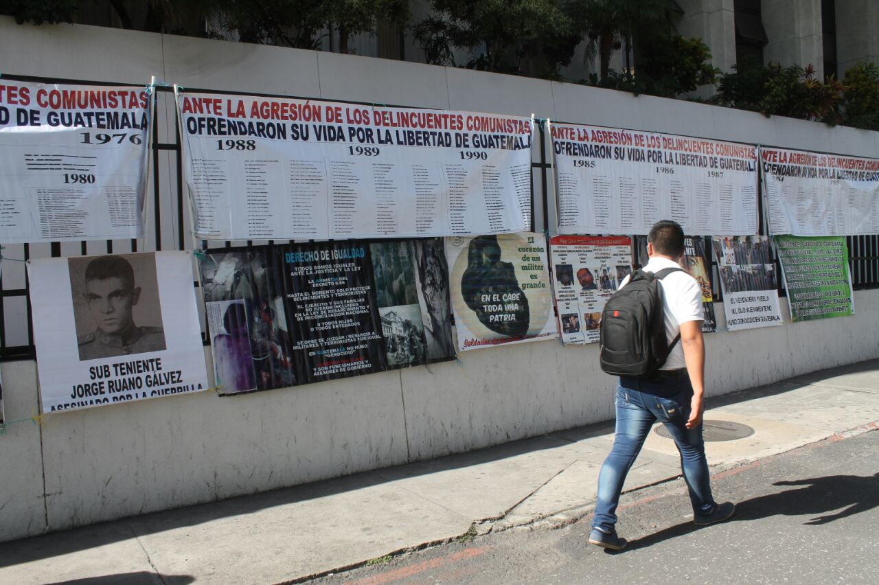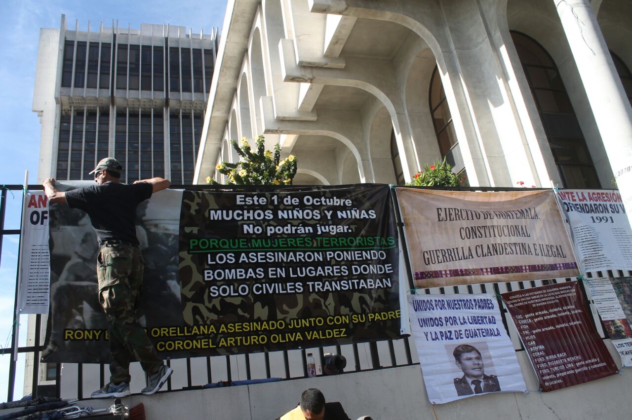 El Movimiento de Reconciliación Nacional colocó esta mañana pancartas frente a Torre de Tribunales en apoyo a los militares sindicados en los casos de Creompaz y Molina Theissen, mientras que otro grupo manifestó en apoyo a las víctimas del conflicto armado para exigir justicia por los desaparecidos.