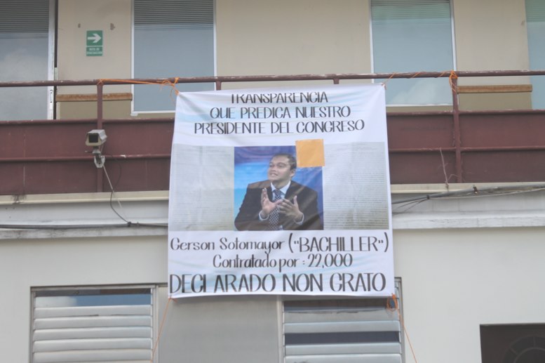 La sanción a los empleados y afiliados al Sindicato de Trabajadores del Congreso de la República (Sintracor), se realizó después que en el parqueo del Congreso se colgó una manta donde se declaró “non grato” a Sotomayor por tener un contrato como asesor de Dirección General pese a no obtener un título universitario. Sin embargo, el extremo fue negado por Sotomayor quien mostró en su defensa un certificado de licenciado en Ciencias Jurídicas.