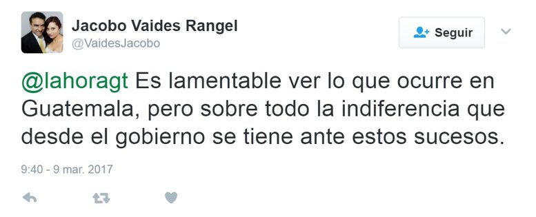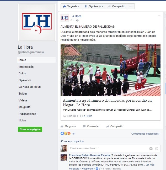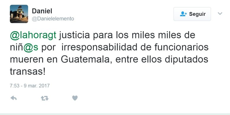 Francisco Rubén Ramírez Escobar: Toda esta tragedia es la consecuencia de la CORRUPCIÓN sistemática rampante en el interior del Estado, efectuada por malos burócratas y políticos indeseables con el contubernio de la iniciativa privada. Es culpable también LA INDIFERENCIA SOCIAL que como sociedad mostramos hacia nuestros semejantes. ES CULPABLE TAMBIÉN el sistema educativo ultradeficiente, cooptado por líderes megalómanos, que en su egoísmo y avaricia niegan a la niñez una preparación académica de altura. ES RESPONSABLE TAMBIÉN el empresario ladrón de impuestos que le niega con sus actos la oportunidad a la nación de salir a flote. Y por último, es culpable el Gobierno por no tener la autoridad y el conocimiento suficiente para ordenar la casa. LE FALLAMOS TODA GUATEMALA A ESTAS NIÑAS QUE FUERON QUEMADAS VIVAS.