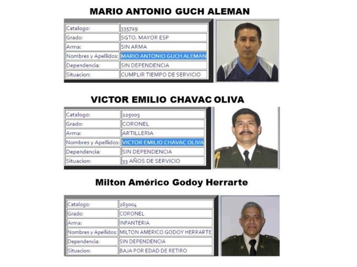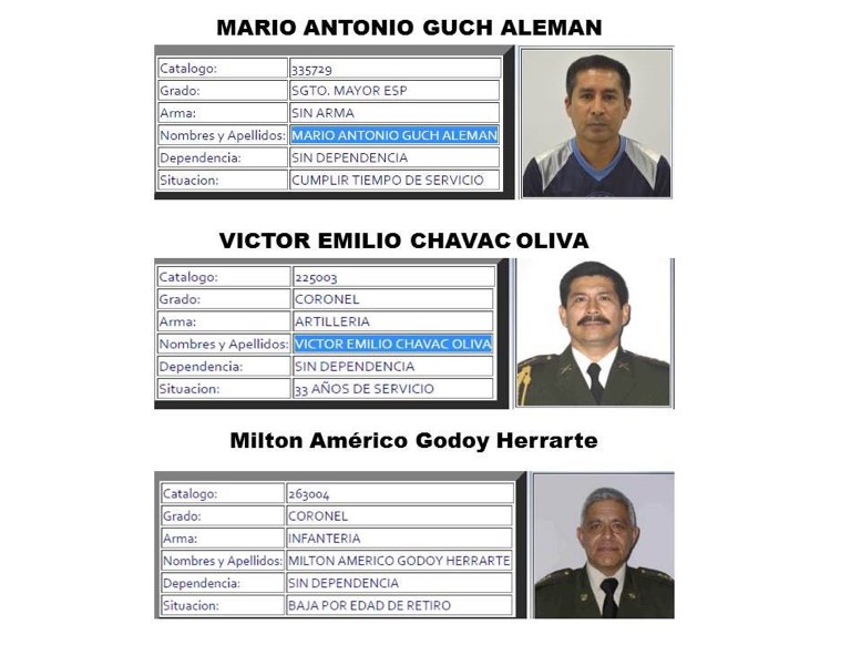 Los detenidos son: el exsargento Mario Antonio Guch Alemán, quien en 2011 era contador de servicio de Ayudantía General en el Ejército, así como los excoroneles Víctor Emilio Chavac Oliva, quien era jefe de Ayudantía del Archivo General y Milton Américo Godoy Herrarte, quien fungía como jefe de Logística de Servicios General de Ayudantía.