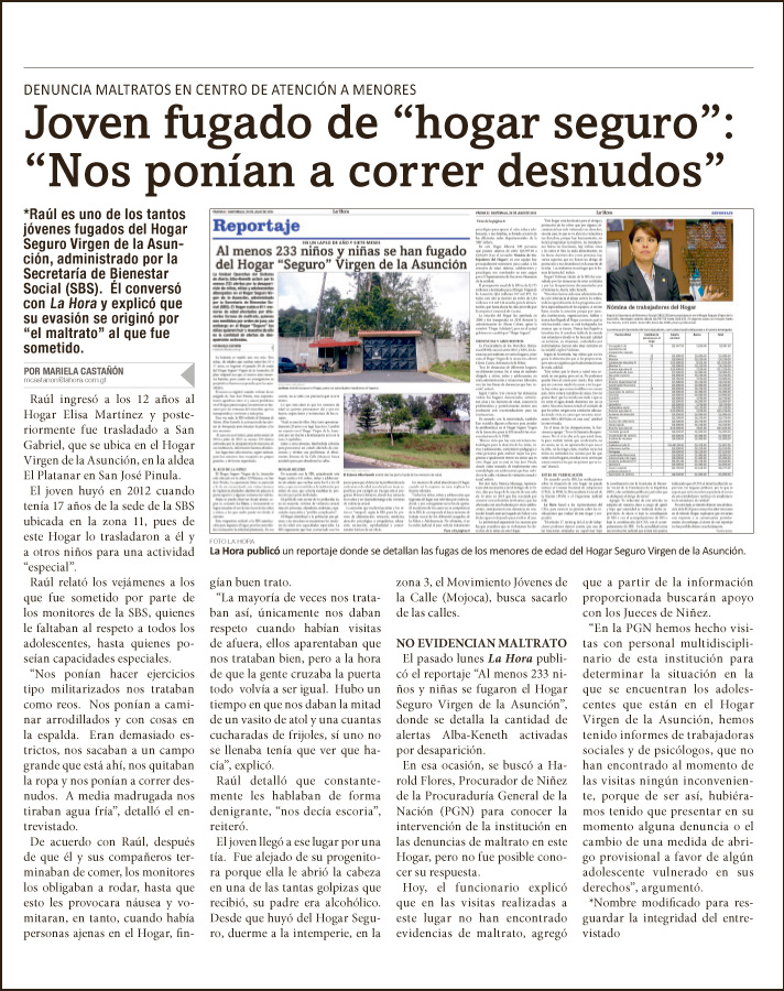 Los testimonios de los niños y niñas que sobrevivieron al maltrato, reflejan la violencia física, psicológica y sexual de la que eran objeto. En sus relatos, explican que eran obligados a hacer ejercicios “tipo militarizados”, pues los ponían a movilizarse de rodillas y con objetos pesados en la espalda. Les quitaban la ropa y los obligaban a correr desnudos. En la madrugada les lanzaban agua fría. Las niñas, dicen que algunas eran sacadas para ser llevadas a casas cerradas, donde las violaban. Otras aseguran que en la clínica del Hogar Seguro fueron violentadas sexualmente por desconocidos, que ingresaban a cometer estos delitos con la autorización de los responsables de este espacio estatal.