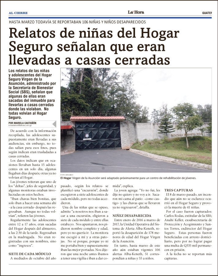 El espacio estatal denominado Hogar Seguro Virgen de la Asunción, administrado por la Secretaría de Bienestar Social (SBS) y que albergó a centenares de niñas, niños y adolescentes (NNA) por casi siete años, fue cerrado el pasado 30 de abril por orden de la Sala de la Corte de Apelaciones de la Niñez y Adolescencia. El Hogar será recordado por los abusos y el maltrato a los que fueron sometidos los menores de edad. La grave situación detonó en un incendio, el pasado 8 de marzo, donde murieron 41 niñas.
