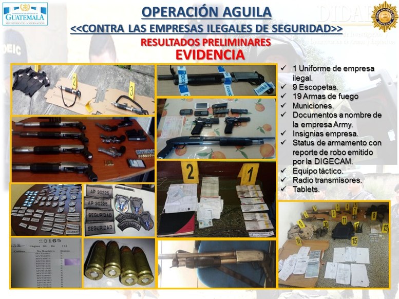 Las autoridades también secuestraron 9 escopetas, 19 armas de fuego, municiones, documentos a nombre de la empresa Army, insignias, estatus del armamento con reporte de robo emitido por la Dirección General de Control de Armas y Municiones (Digecam), además de radiotransmisores y tablets.