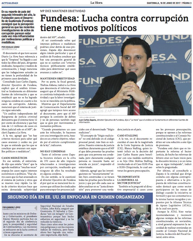 Tanto en el informe de FUNDESA como lo expresado en mis respuestas, nunca se hizo referencia al concepto «lucha contra la corrupción» si no a que debido a que no existen criterios técnicos sobre los cuales el MP pueda priorizar casos, las motivaciones de los mismos en general, muchas veces son por temas políticos o mediáticos, especialmente en los últimos casos.