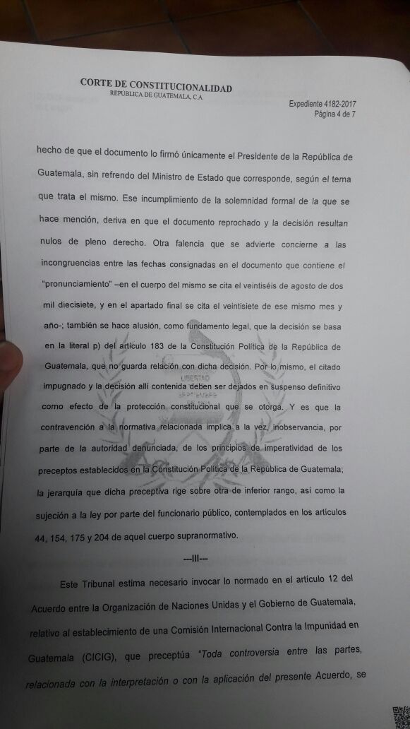 La CC otorgó un amparo provisional al PDH pero el acto reclamado (la declaratoria de non grato y expulsión de Velásquez) se suspende en definitiva porque los magistrados consideran que el presidente actuó de manera ilegal contraviniendo una norma constitucional.
