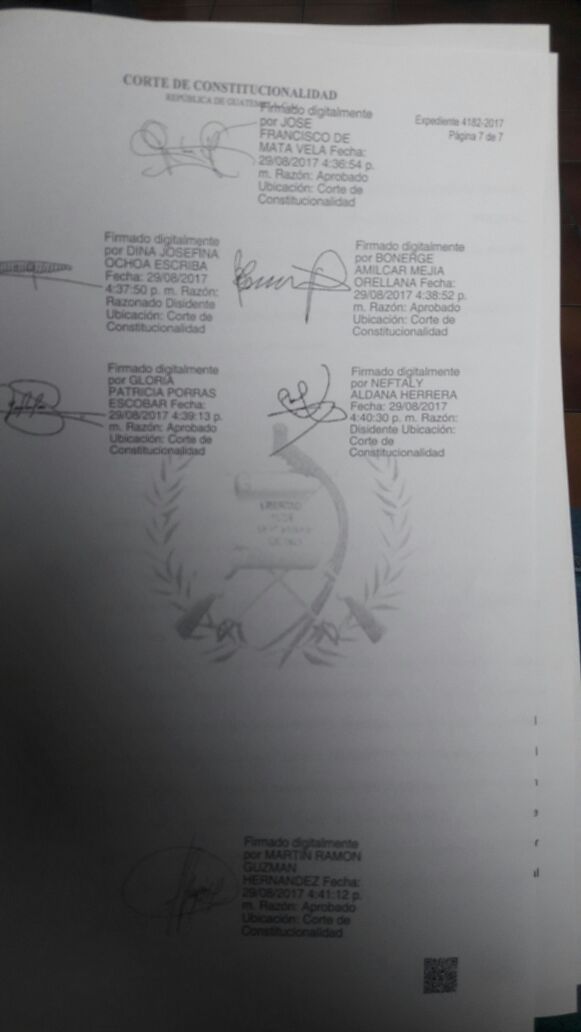 Los magistrados que votaron a favor de esa decisión fueron: Francisco de Mata Vela, Gloria Porras, Boanerge Mejía, en contra Dina Ochoa y Neftalí Aldana.