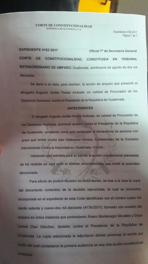 La Corte de Constitucionalidad (CC) amparó al procurador de los Derechos Humanos (PDH), Jordán Rodas para que el jefe de la Comisión Internacional contra la Impunidad en Guatemala (CICIG), Iván Velásquez no sea expulsado del país en forma definitiva.