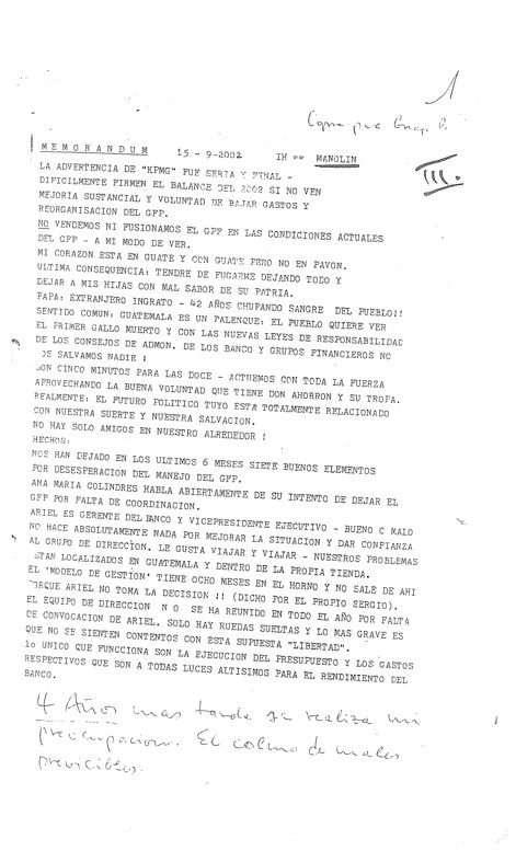 «La advertencia de KPMG fue seria y final”, decía en la primera línea. “Difícilmente firmen el balance de 2002 si no ven mejoría sustancial y voluntad de bajar gastos y reorganización del GFP (Grupo Financiero del País)”. Desde que Manuel Eduardo González dejó Bancafé para dedicarse a su carrera política en la Gran Alianza Nacional (Gana), los socios entraron en pánico. No existía un sucesor natural para el puesto y la entidad ya estaba en graves problemas financieros.
