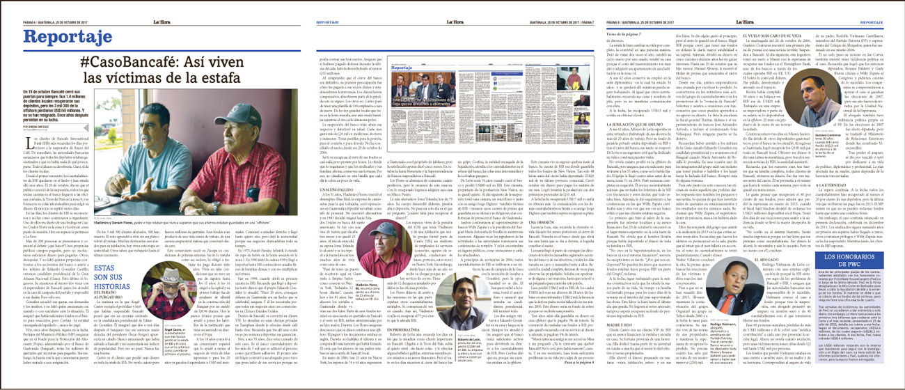 Once años después de su cierre, Bancafé ha quedado casi en el olvido -salvo porque el proceso sigue abierto y 3,300 clientes de BIB esperan la devolución de su dinero. Pero cada vez que una investigación a cargo del Ministerio Público (MP) y la Comisión Internacional Contra la Impunidad (CICIG) menciona el nombre de un banco del sistema, el fantasma de Bancafé reaparece.