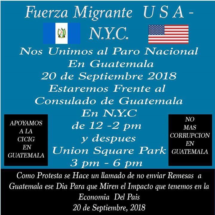 Desde Nueva York migrantes guatemaltecos residentes en el extranjero anunciaron en redes sociales dos manifestaciones a realizarse frente a las oficinas del Consulado de Guatemala en esa ciudad y después en el Union Square Park, con el objetivo de manifestar su apoyo a la Comisión Internacional contra la Impunidad en Guatemala (CICIG) este jueves.