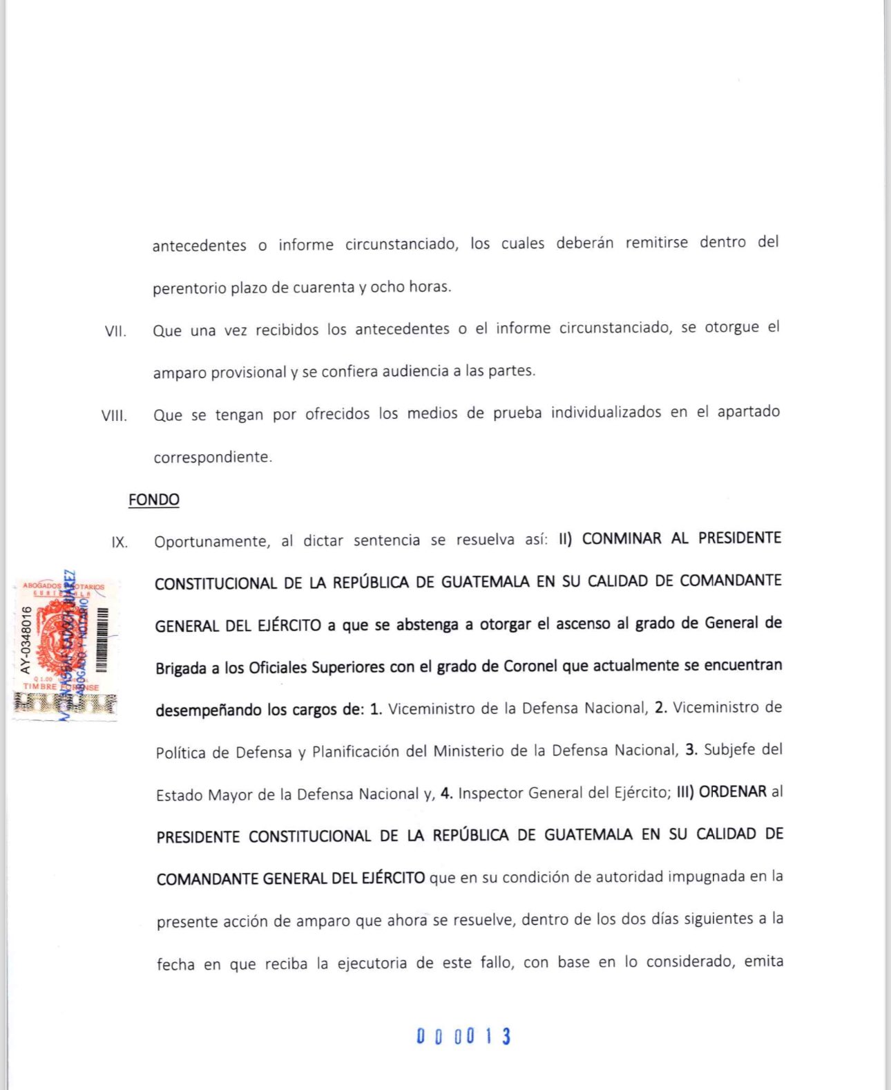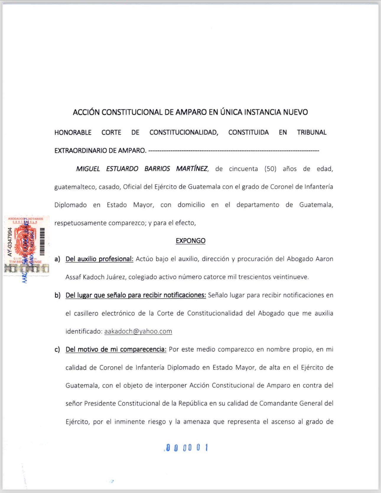 Asimismo, el coronel describió que como ciudadano guatemalteco afecta y causa agravio a su persona, el no poder vivir en un Estado en el cual el Poder Público garantice la justicia, la seguridad y certeza jurídica.