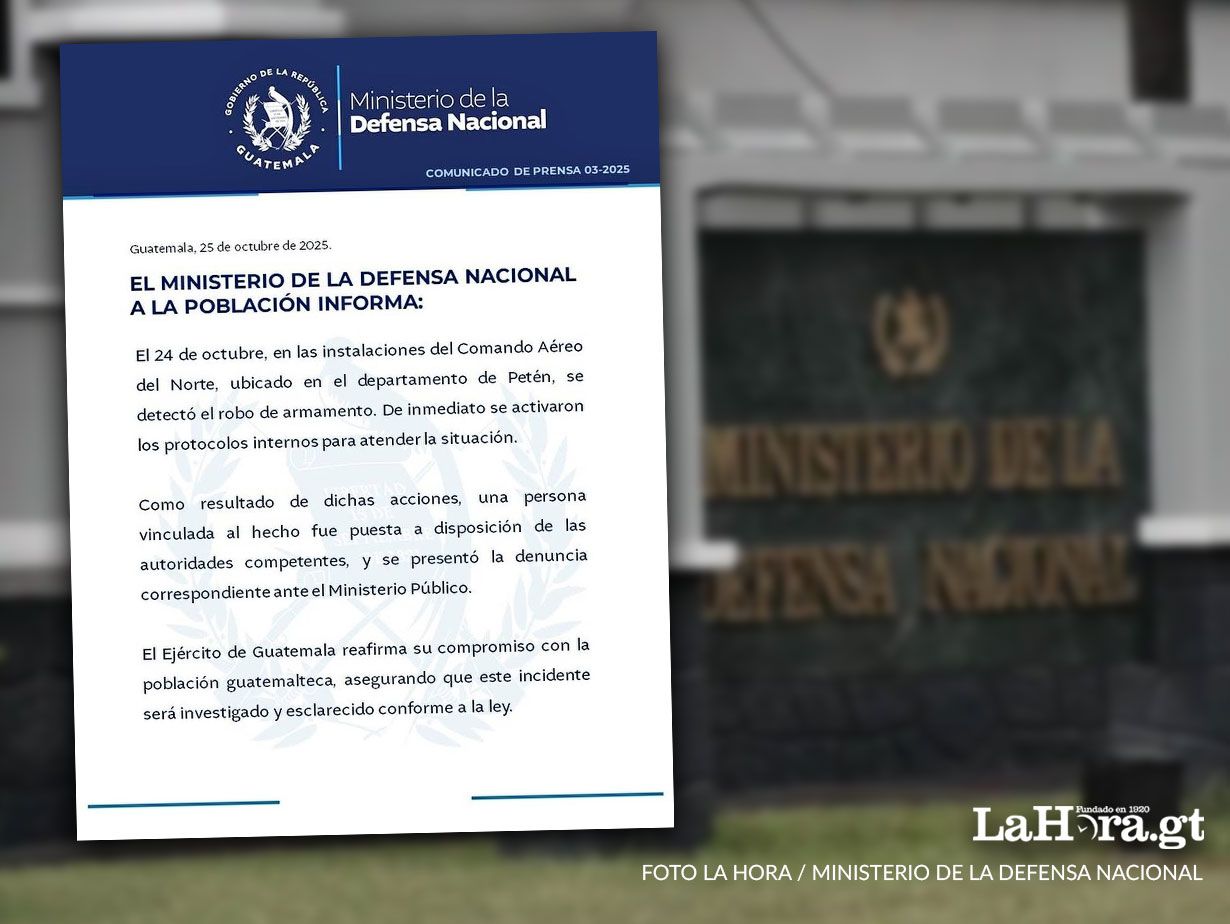 Este sábado 25 de octubre, el Ministerio de la Defensa Nacional (Mindef) informó sobre el robo de armamento en las instalaciones del Comando Aéreo del Norte, ubicado en el departamento de Petén.