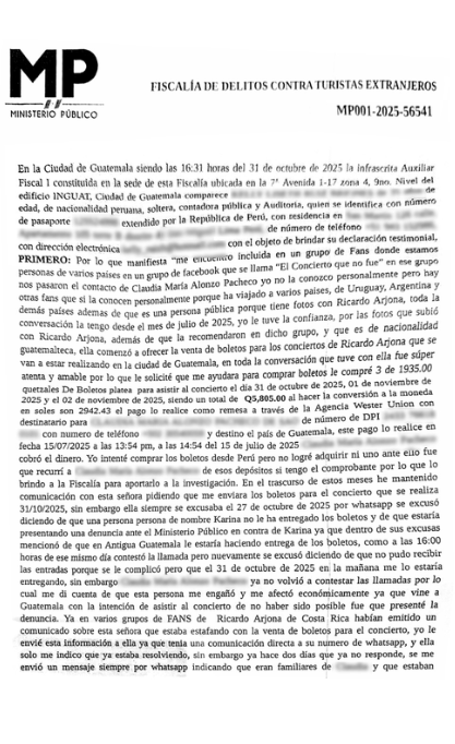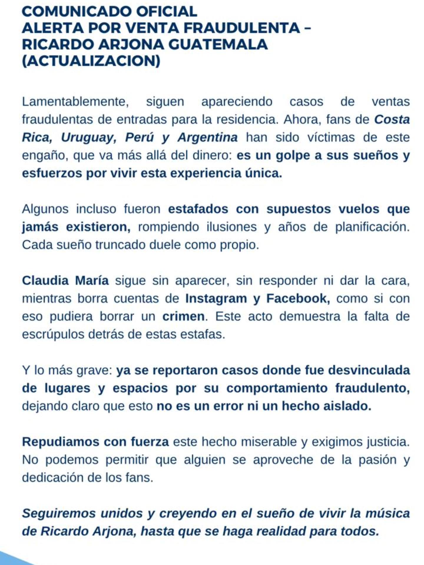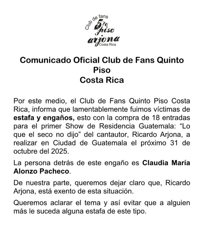 De acuerdo con varios comunicado difundidos por los clubes de fans de Ricardo Arjona, decenas de seguidores de distintos países e incluso de Guatemala habrían sido víctimas de estafa durante la compra de boletos para sus conciertos en el país.