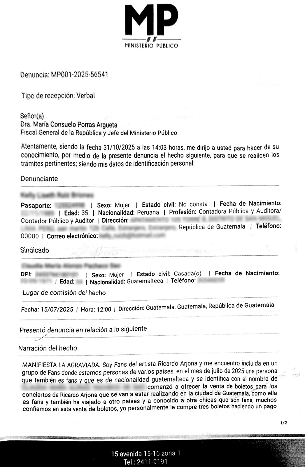 El sueño de ver a Ricardo Arjona se convirtió en una pesadilla. “Fui a la comisaría de Antigua, pero me dijeron que no tenían los recursos para recibir la denuncia. No tenían computadora, todo lo hacían con su celular”, contó Kelly.
