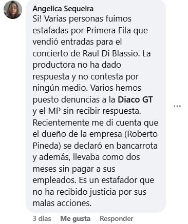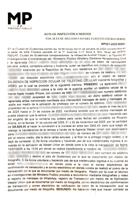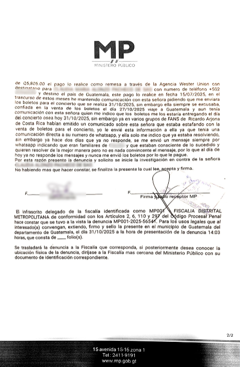 “En mi caso, le deposité Q5,805, nunca recibí mis entradas», asimismo afirmó que todo terminó en la Fiscalía del Ministerio Público, donde presentó formalmente su denuncia.