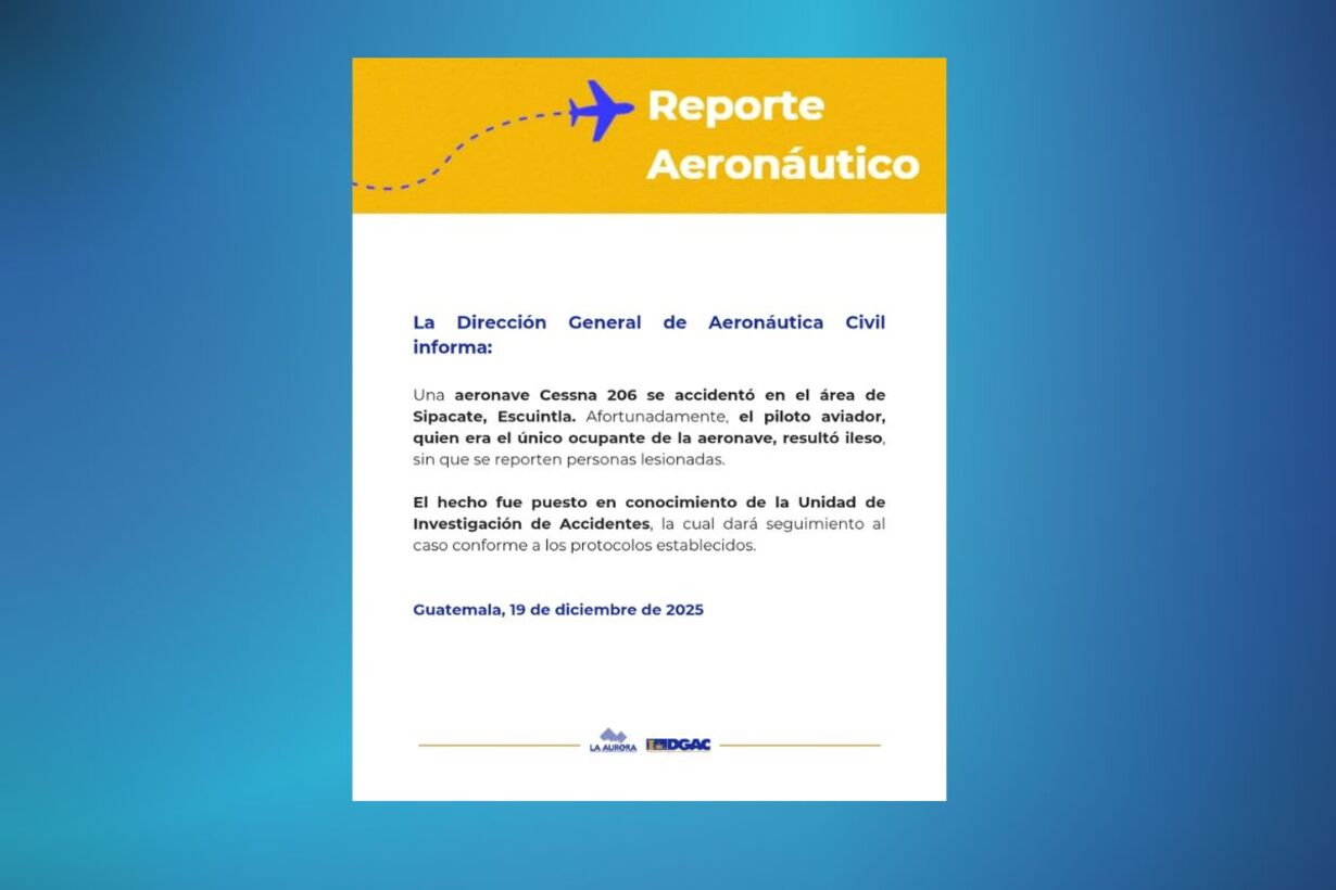 Una aeronave tipo Cessna 206 se accidentó en el área de Sipacate, departamento de Escuintla, según informó la Dirección General de Aeronáutica Civil (DGAC).