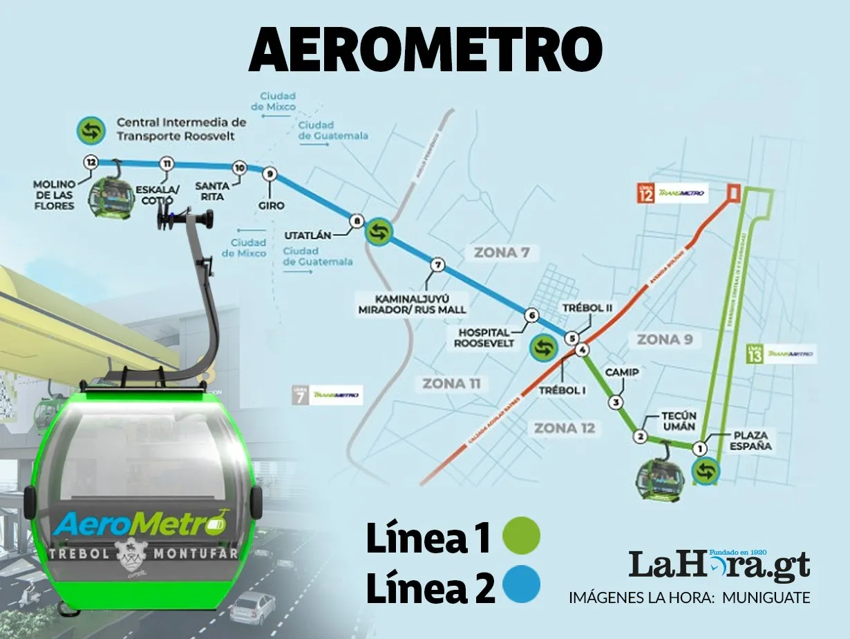 - La Línea 2 estará integrada por ocho estaciones, 360 cabinas y 50 torres, y conectará El Trébol con la colonia Molino de Las Flores, en Mixco.